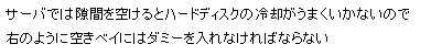 業務用サーバはHDDを差し込むケース自体が密閉構造になっていて、後に高回転ファンをつけてHDDの隙間を通して空気を強制的に吸い込む構造になっている。箱に掃除機がついているイメージだ。だから小さい隙間でも風速が高速がゆえに十分な流量が得られる仕組みなのである。そのためにサーバは爆音となるのだが、空きベイにちゃんとダミーを差し込んでおかないと、そこからしか空気が流れなくなりすぐ死亡HDDがでる。我々が使う通常のPCにおいて、HDDを1つ飛ばしで設置する理由は、サーバの様に負圧の高速流で冷却するのではないのでファンからの風を直接HDDに当てる必要があるためだ。