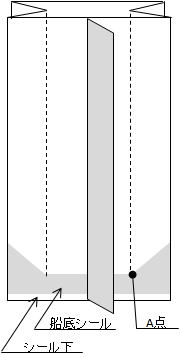 | 一文字のシールに対して、斜め三角のシールを入れることで、袋底部の折り目を付けられ、また一文字シールは、A点に集中する内部圧力を三角を加えて面で受けることで破袋の防止。味噌などの重量物では、ガセットを深くとり縦置きに陳列することが出来ます。 |